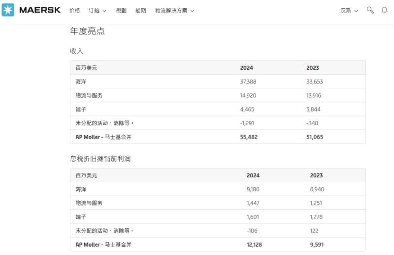 近日,航運巨頭馬士基(Maersk)公布了2024年全年財務業績。報告顯示,其2024年2024年營收為554.8億美元,同比增長8.6%,各個業務板塊均實現增長。