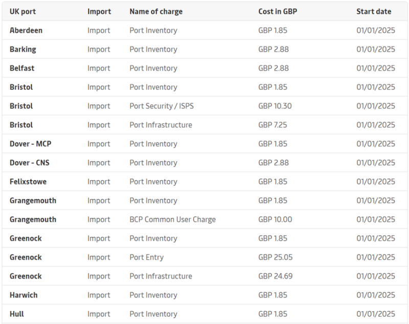 詳細來看,馬士基宣布自1月1日起,將對英國港口實施新的集裝箱費率。總的來看,中小港口的費率變化不大,但不分大港口的港口庫存費、港口設施費、港口安全費都有一些漲幅,部分港口還調整了入境費,例如利物浦港口和泰晤士港的入境費,就分別調整為25.05英鎊和16.41英鎊。