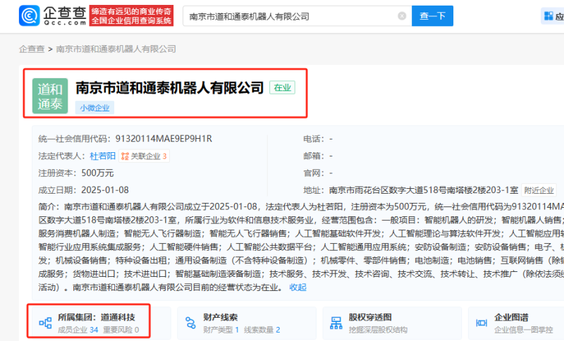 企查查的信息顯示,最近一家專注于智能機器人及人工智能領域的新公司——南京市道和通泰機器人有限公司成立。該公司主營業務涵蓋智能機器人的研發與銷售、智能無人飛行器的制造以及人工智能基礎軟件、理論與算法、應用軟件的開發等。