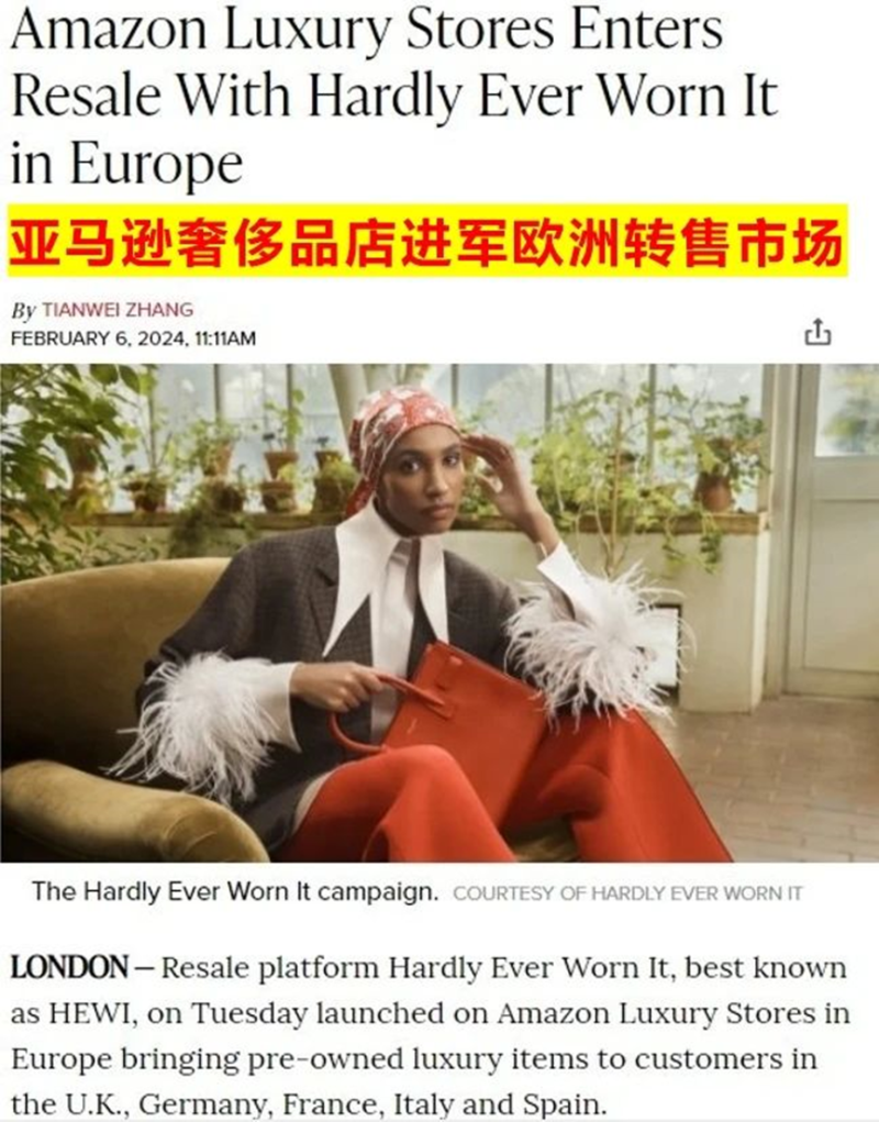 因此,許多電商平臺都在加碼這一業務。比如亞馬遜,去年年初,它宣布與英國奢侈品轉售平臺 Hardly Ever Worn It (HEWI)達成合作,以此進軍歐洲奢侈品轉售市場。具體而言,HEWI會入駐亞馬遜,為亞馬遜的消費者提供二手奢侈品,并負責相關商品的篩選和認證流程。