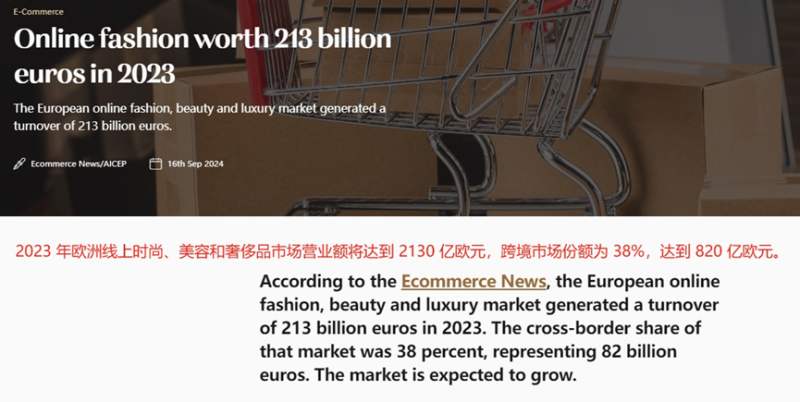 當前,線上平臺已經成為了銷售時尚產品和奢侈品的重要渠道。根據Ecommerce News的數據,歐洲時尚、美容和奢侈品零售業正在向數字化轉型,超過三成的銷售都已經從線下轉向了線上。在2023年,歐洲線上時尚、美容和奢侈品市場的規模就已經達到了2130億歐元,并且未來幾年預計還將持續增長。