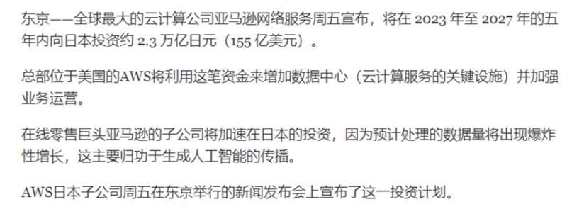 此前亞馬遜旗下網絡服務公司(AWS)就宣布,將在2027年之前,在日本投資2.3萬億日元(約合155億美元),以擴建東京和大版的數據中心、加強業務運營,以及為日本企業客戶提供一些人工智能服務。