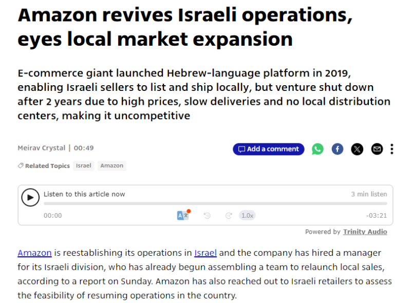 彼時,亞馬遜并未在以色列設立本地倉儲,而是采用“商家自配送”(FBM)模式,讓賣家自行管理存儲和發貨。這一模式未能提供有競爭力的價格和快速配送,使平臺對以色列消費者的吸引力下降。