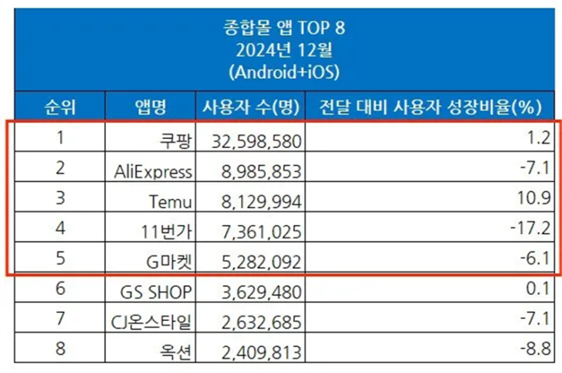 去年12月韓國電商平臺用戶量排行 圖源:yna.co.kr