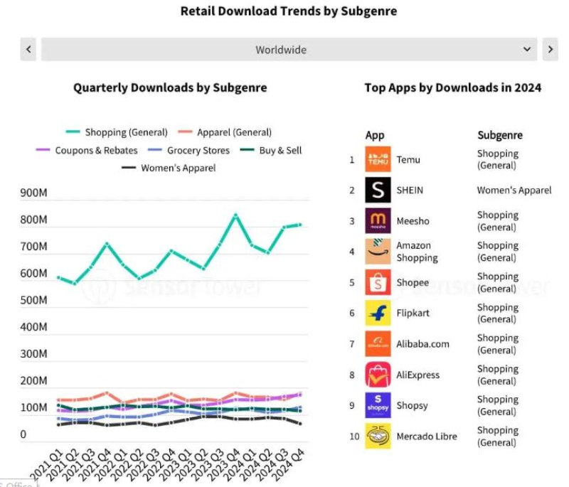 日前,Sensor Tower發布的《2025年移動市場報告》顯示,拼多多海外版Temu已經成為2024年全球下載量最高的購物應用程序。