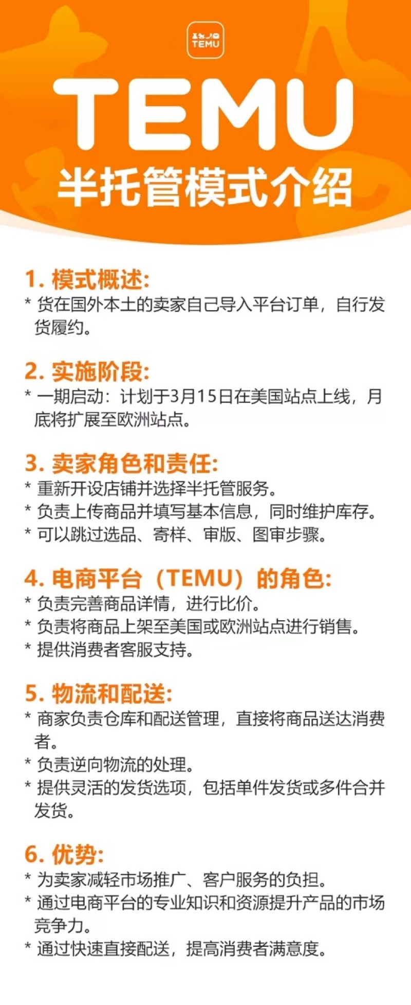 據悉,去年3月份,Temu就先在美國站點啟動半托管模式,并在當月月底擴展至歐洲各大站點。至此,Temu改變了以往的全托管模式,將大部分重心轉移到半托管。