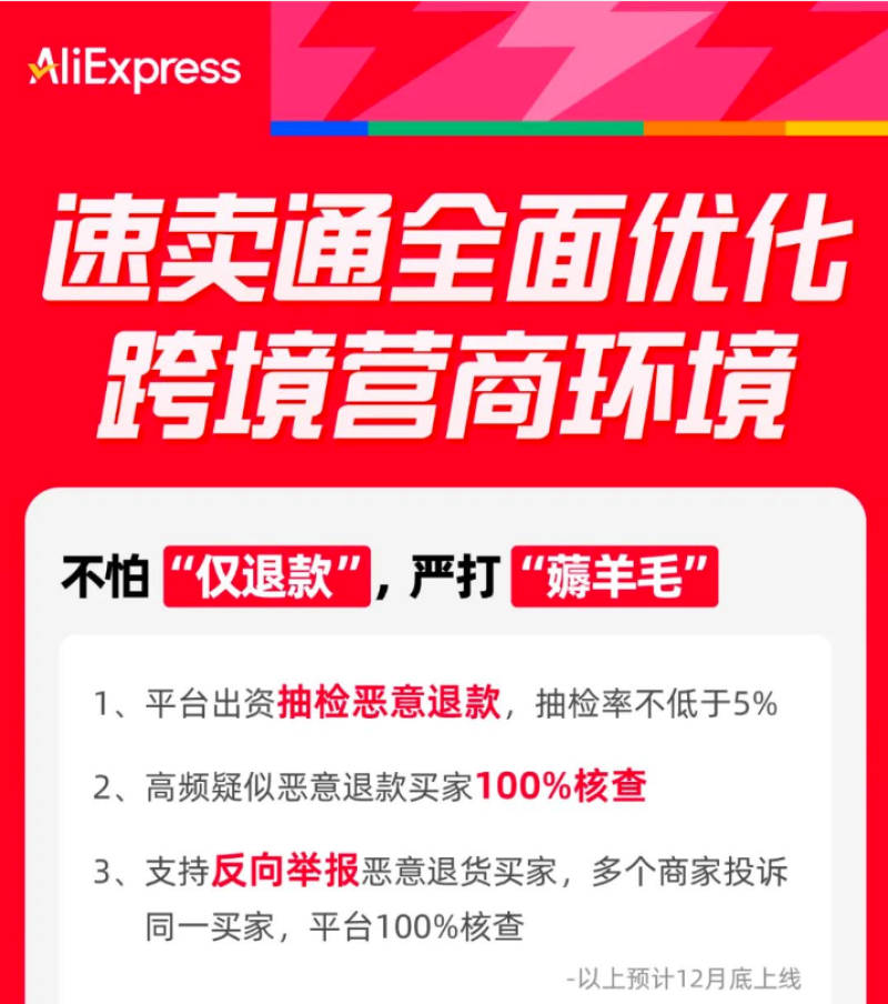 值得一提的是,速賣通的平臺優(yōu)勢還體現(xiàn)在營商環(huán)境不斷優(yōu)化這方面。2024年11月,速賣通出手整治“羊毛黨”,大快人心。具體來看,速賣通將主動攔截治理那些惡意退款的羊毛黨,并且支持反向舉報惡意退貨買家,平臺會進行嚴(yán)格的審查。此外,速賣通還優(yōu)化了全托管退款率罰則,降低了中高貨值商品的罰款金額。