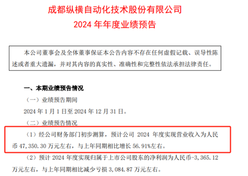 消息顯示,近日,成都縱橫自動化技術股份有限公司(下稱“縱橫股份”)發布了2024年度業績預報,報告指出,預計2024年1月1日到2024年12月31日,縱橫股份總計將實現營收7.74億元,與2023年相比增長約56.91%。