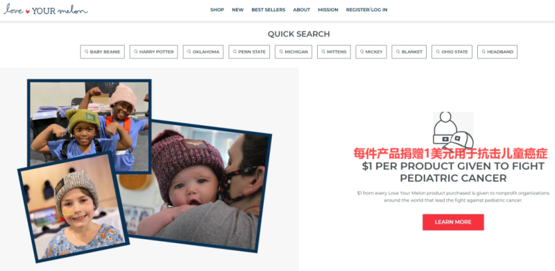 在Love Your Melon的主頁上可以看到,他們承諾品牌每賣出一頂帽子就會為美國每個與癌癥作斗爭的兒童捐贈1美元,這一商業模式在當時無疑是新鮮的,因此讓品牌快速獲得了市場的關注,大量志同道合的消費者便成為了品牌最忠實的用戶。