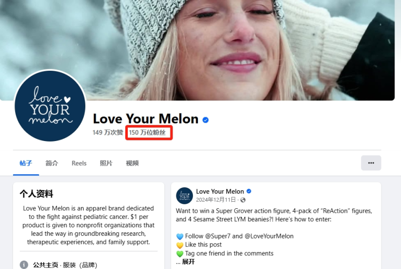 從品牌的成長史來看,起初的知名度并不高,只是在校園內進行傳播,事情的轉折點發生在2013年,Love Your Melon開始借助Facebook和Instagram這些社交媒體平臺進行推廣,并迅速火出圈。截至目前,Love Your Melon在社交媒體上已經擁有大量的忠實粉絲,光是在Facebook上的粉絲就有150萬。