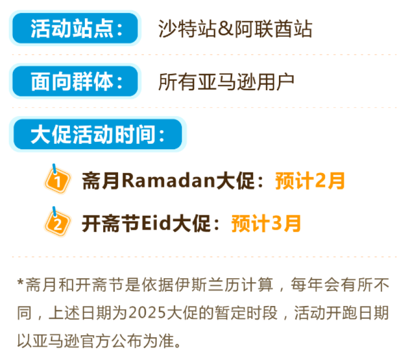 根據亞馬遜全球開店發布的消息,亞馬遜中東站(沙特站和阿聯酋站)預計將在2月份舉辦齋月Ramadan大促、在3月舉辦開齋節Eid大促,不過目前大促的具體時間還未公布。