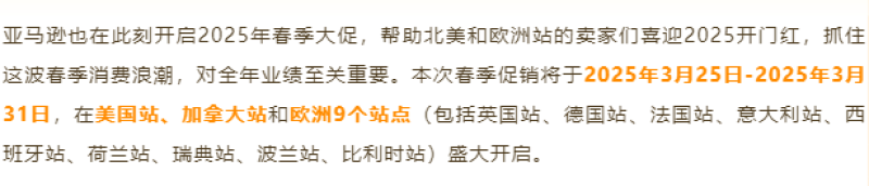 最后,亞馬遜2025年春季大促正式定檔,具體時間將于2025年3月25日至2025年3月31日,在美國站、加拿大站和歐洲9個站點同步開啟。本次大促涵蓋家居、時尚等多個品類,設有專屬引導頁面并大力推廣。