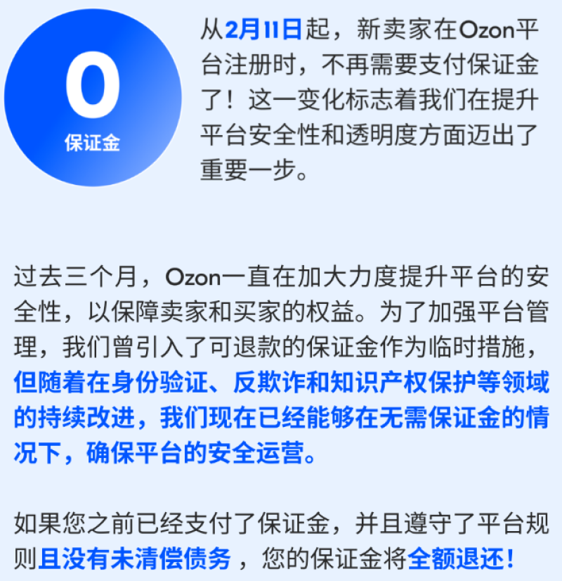 具體來看,2024年10月份,Ozon發布消息稱,要對新賣家以及長期未在平臺上活躍的賣家收取2400元人民幣的可退還保證金。但隨著平臺在身份驗證、反欺詐和知識產權保護等方面的不斷完善,Ozon已經能夠在無保證金的情況下確保安全運營。因此,Ozon決定取消新賣家的保證金要求,以降低入駐門檻,吸引更多優質賣家加入平臺。