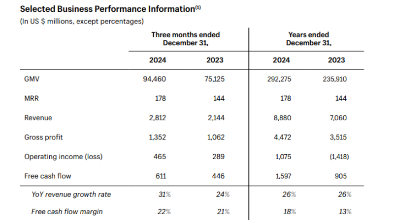 財報顯示,Shopify 2024年全年GMV達到2922.75億美元,同比增長24%,為三年來最高增速;全年營收達到88.8億美元,同比增長26%;全年運營利潤達到10.75億美元,較2023年顯著增長。
