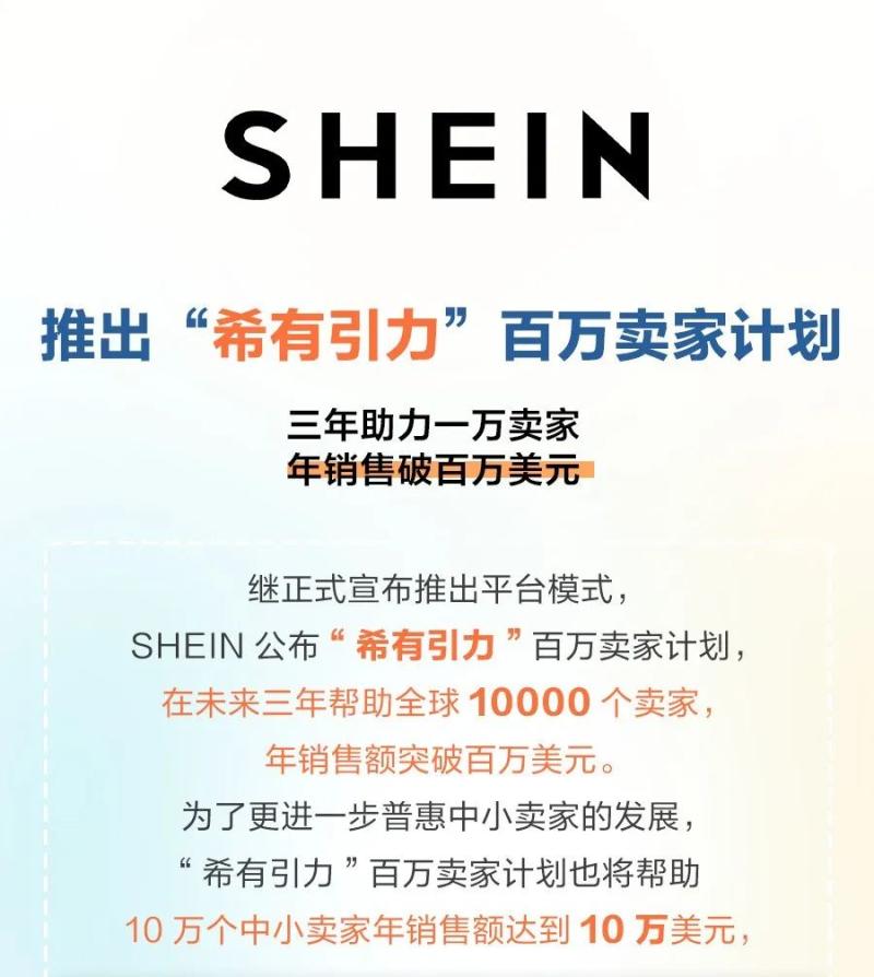 2023年6月,SHEIN公布了“希有引力”百萬(wàn)賣家計(jì)劃,希望能在三年內(nèi)賦能一萬(wàn)家賣家實(shí)現(xiàn)年銷售額超百萬(wàn)美元,同時(shí)助力十萬(wàn)中小賣家年銷售額突破十萬(wàn)美金。