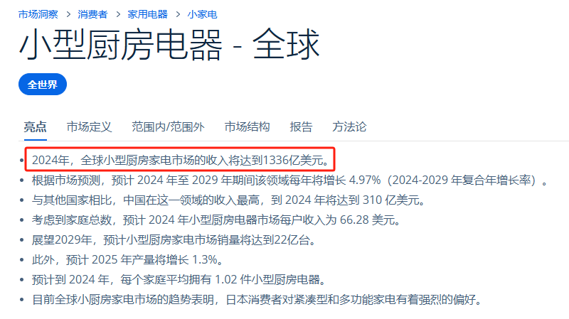 據(jù)Statista的數(shù)據(jù)預(yù)測,2024年全球廚房小家庭市場規(guī)模將達(dá)到1336億美元,預(yù)計(jì)2024年至2029年期間市場以4.97%的年復(fù)合增長率增長,市場規(guī)模進(jìn)一步擴(kuò)大。并且到2029年時(shí),廚房小家電市場銷量將達(dá)到22億臺(tái)。