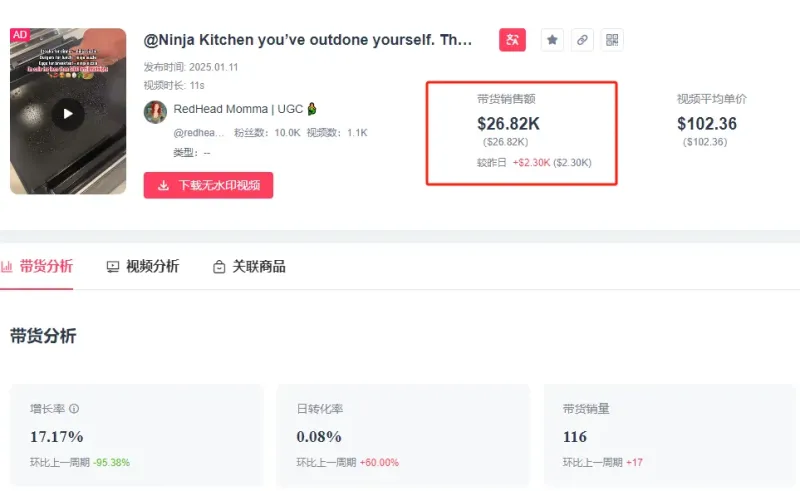 除了產(chǎn)品本身所具備的競爭優(yōu)勢外,達(dá)人帶貨的功勞也必不可少。目前該產(chǎn)品關(guān)聯(lián)視頻達(dá)到194個(gè),關(guān)聯(lián)達(dá)人有81個(gè),其中貢獻(xiàn)銷售額最多的一條視頻是由博主@RedHead Momma發(fā)布的,視頻播放量達(dá)到48.5萬次,帶貨銷售額達(dá)到2.68萬美金。