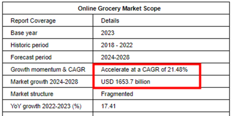 根據研究機構Technavio去年年底公布的一份最新報告,全球在線雜貨市場的規模正在不斷擴大,預計在2024——2028年間,該市場的的復合年增長率會達到21.48%,僅4年就能增長1.65萬億美元。沃爾瑪、亞馬遜、Target、Costco等在線雜貨平臺是這一市場的“頭號玩家”。