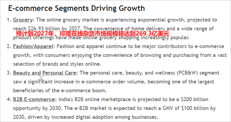 以印度為例,根據印度品牌權益基金會(IBEF)公布的數據,當前印度在線雜貨市場正在呈指數級增長。2021年,這一市場的規模僅為39.5億美元,而到了2027年,這一數字預計將會增長到269.3億美元,暴漲超過581%。不僅如此,印度在線雜貨市場的快速增長還帶動了快商務的發展,2022財年至2024財年,印度快商務市場商品交易總額的年增長率超過70%,不可謂不驚人。