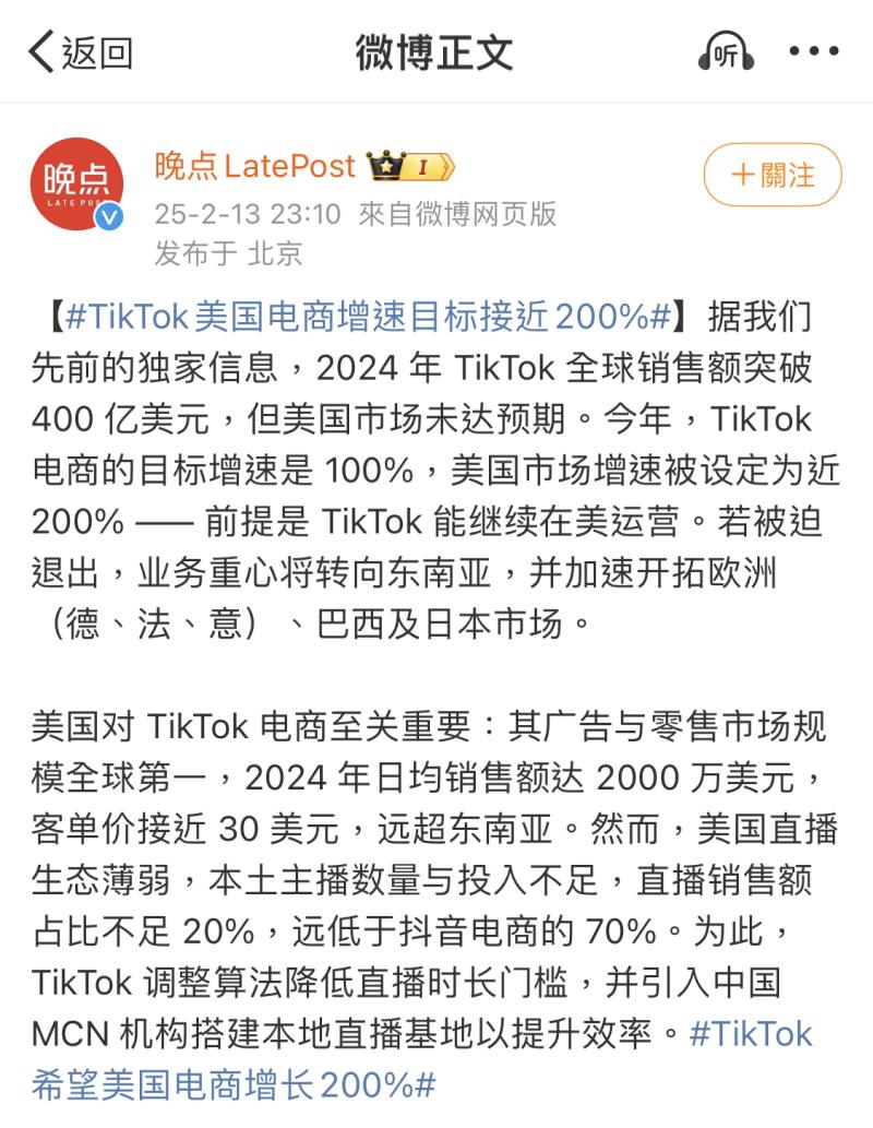 據(jù)晚點(diǎn)LatePost消息,TikTok電商2024年完成了超400億美元的銷售額,其中東南亞市場份額提升,美國表現(xiàn)不及預(yù)期。新的一年,TikTok電商團(tuán)隊制定了近100%的增長目標(biāo),其中,美國市場被寄予了最多的期待,增速目標(biāo)接近200%。