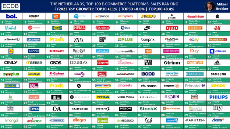 在德國電子商務數據庫(ECDB)去年11月公布的荷蘭100強電商平臺排行榜中,亞馬遜排名第二,超過了荷蘭本土電商Coolblue,僅次于Bol.com。我國跨境電商平臺速賣通和SHEIN也都沖上了前十,一個排名第六,一個排名第八,還有Temu排名第37。