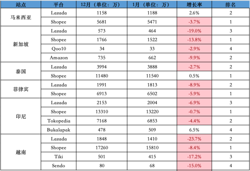 1月東南亞電商訪問量下滑 圖源:跨境東南亞