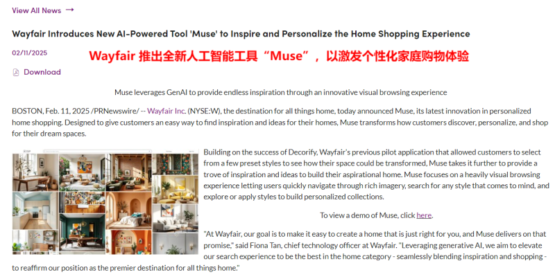 近日,Wayfair發(fā)布公告稱,其最新版?zhèn)€性化家居購物AI工具,Muse已正式上線。這項AI工具可幫助客戶輕松找到家裝靈感,打造個性化的家居購物體驗。