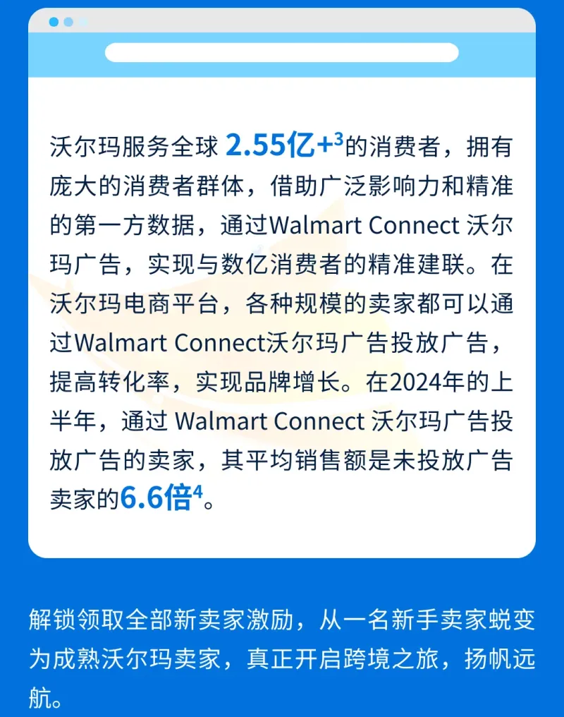 沃爾瑪全球電商向賣家提供包括倉儲、揀貨、包裝和配送的一站式物流配送服務,助力賣家實現兩日達交付訂單。在沃爾瑪電商平臺,帶有兩日達和沃爾瑪配送標簽的商品,GMV平均提升50%。廣告投放方面,在2024年上半年,通過Walmart Connect沃爾瑪廣告投放廣告的賣家,其平均銷售額是未投放廣告賣家的6.6倍。