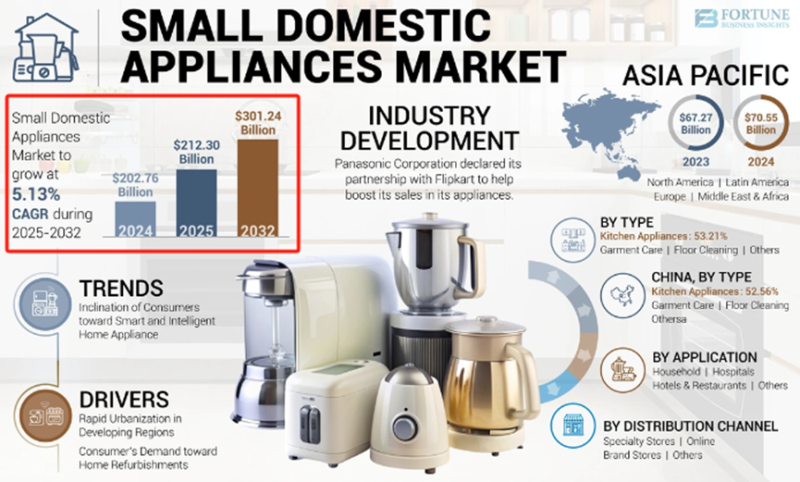 Fortune Business Insights的調查數據就顯示,2024年全球小家電市場規模為2027.6億美元,市場份額預計將從2025年的2123億美元增長至2032年的3012.4億美元,預測期內復合年增長率為5.13%。