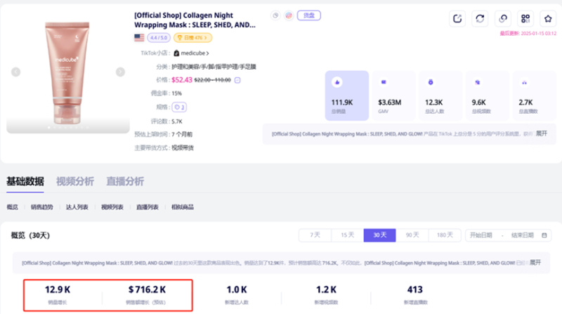 譬如,不久前就有數(shù)據(jù)顯示,韓國藥妝品牌medicube在TikTok上表現(xiàn)優(yōu)異,總計斬獲銷售額2538萬美元(約合人民幣1.8億)。該品牌旗下一款免洗睡眠面膜更是僅憑一己之力,在7個月內拿下363萬美元的GMV,可以說是撐起全店銷售業(yè)績的半邊天。