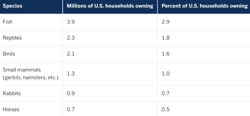 據2024年AVMA(美國獸醫協會)寵物所有權和人口統計資料手冊顯示,除了狗和貓,魚類、爬行動物、鳥類和小型哺乳動物這些小眾寵物也十分受歡迎,其中養魚的家庭數量達到了390萬,爬行動物則有230萬。
