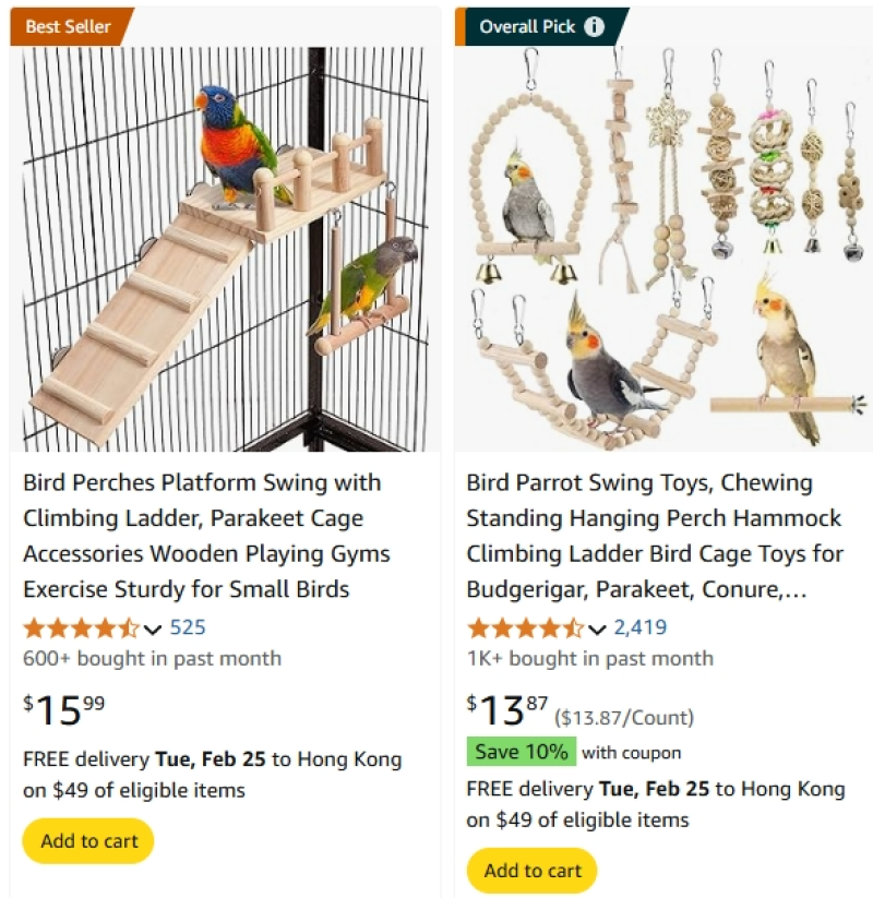 簡單來說,就是寵物的健康護理和舒適生活變得更加重要。舉例來說,此前一款掛在鳥籠內部供鳥兒玩耍的道具在亞馬遜上暢銷,通過一些造型的使用,可以為鳥兒提供玩耍的樂趣,一周銷量十分可觀。