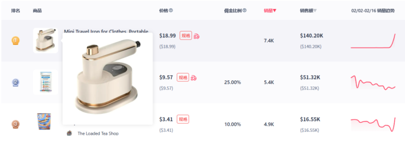 近日,據(jù)超店有數(shù)數(shù)據(jù)顯示,一款迷你旅行熨斗在TikTok上的銷量直直飆升,在2月16日這天賣出了約7400件,累計(jì)銷售額超過14萬(wàn)美金,一舉登頂當(dāng)日的TikTok美區(qū)熱銷商品榜。