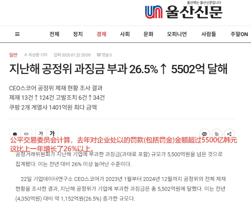 據委員會統計,2024年對企業的制裁數量為124起,處罰對象總數為308家,其中舉報案件有34起,均有一定程度的上漲。另外,對企業的罰款總額也明顯多了不少,從2023年的4350億韓元增加到5502億韓元,同比增長26.5%。
