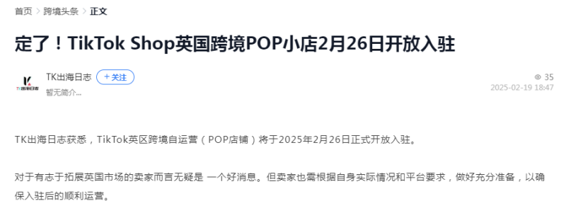 2月20日消息,TikTok Shop英區跨境自運營(POP店鋪)將于2025年2月26日正式開放入駐。迄今為止,TikTok已在印度尼西亞、菲律賓、越南、泰國、馬來西亞、新加坡、英國、美國、沙特阿拉伯、西班牙及墨西哥共11個國家推出了閉環電商業務體系。