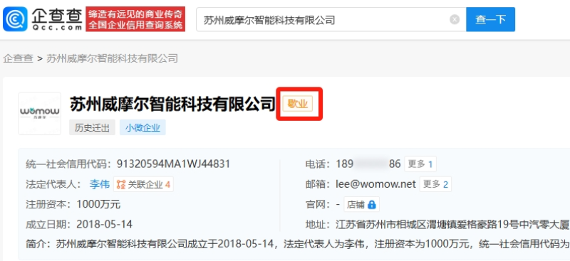 在此之前,該品牌在國內多個電商平臺也有設置旗艦店,叫做“萬摩爾”,但如今在國內店鋪搜索該品牌,大多都是異常狀態,只有少數鏈接還在正常銷售。另外,目前在企查查上查詢Womow所屬的蘇州威摩爾智能科技有限公司,頁面顯示其在工商登記系統的狀態也是“歇業”。