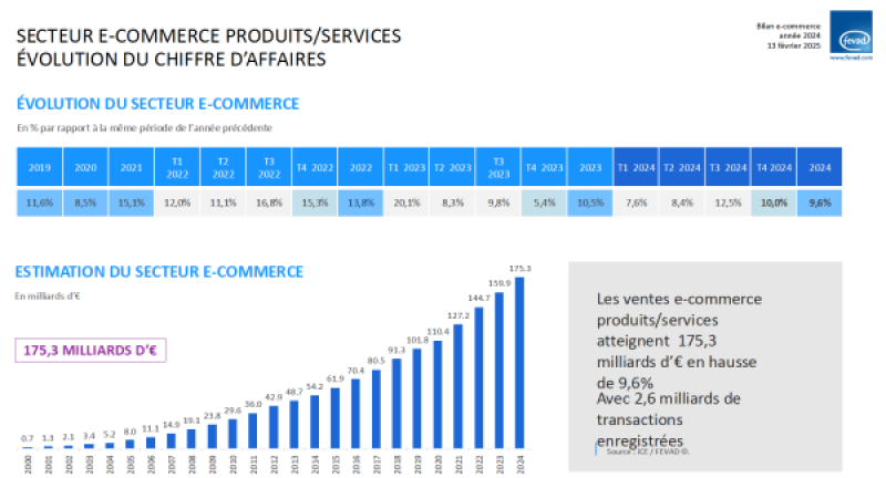 近日,法國電商銷售聯合會(Fevad)發(fā)布一項關于法國電商銷售的最新數據,2024年法國電商市場總收入達1753億歐元,同比增長9.6%。相比過去兩年,線上交易量實現真正回升,一年內增長約10%,此前電商市場增長主要受到通貨膨脹的推動。