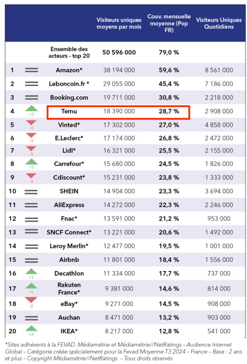 憑借低價優(yōu)勢和更為全面的產品選擇,去年第三季度,Temu還一躍成為法國第四大電商平臺,僅次于亞馬遜、LeBonCoin和Booking,平均每月吸引1840萬獨立訪客,占法國總人口數的28.7%。
