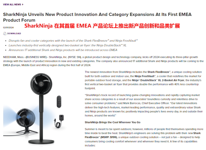 SharkNinja首席執行官Mark Barrocas表示,“2024年是我們迄今為止業績表現最出色的一年,這得益于行之有效的三支柱戰略。接下來,我們將繼續保持信心,為顧客提供更加滿意的產品和服務?!?/span>