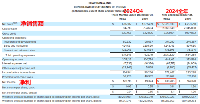 SharkNinja2024凈利4.387億美金 圖源:ir.sharkninja