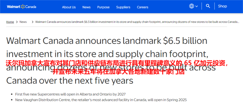 今年1月底,沃爾瑪加拿大公司宣布,將在未來五年內(nèi),對加拿大業(yè)務投資65億加元(約合45億美元),用于新建零售門店,進一步擴大業(yè)務覆蓋范圍。預計在2027年,將有五家超級購物中心陸續(xù)上線。值得一提的是,此次投資是沃爾瑪自進入加拿大市場以來,拿出的最大一筆投資。