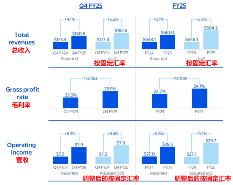 近日,沃爾瑪公布最新業(yè)績報告,2025財年第四季度,公司總收入1806億美元,同比增長4.1%;毛利率上漲53個基點,主要受沃爾瑪美國業(yè)務推動。2025財年,公司全年收入6810億美元,同比增長5.1%,超出分析師預期。(沃爾瑪財年從每年的2月1日開始,到次年的1月31日結(jié)束)