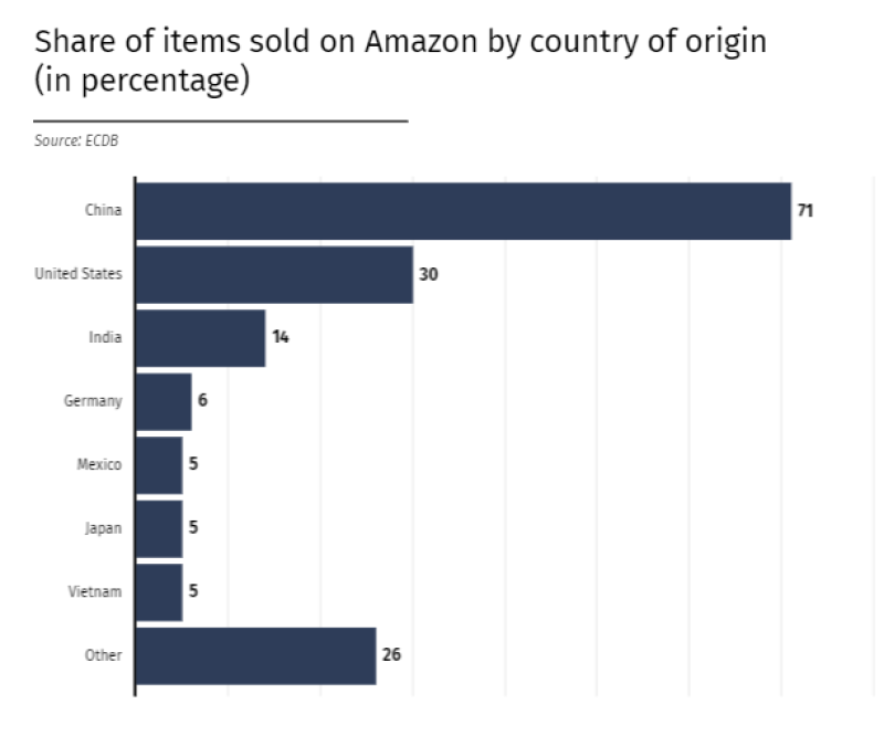 另一項(xiàng)來自電商數(shù)據(jù)庫ECDB的研究數(shù)據(jù)也側(cè)面印證了這一現(xiàn)象,在亞馬遜上,超過70%的產(chǎn)品都是中國制造。即便賣家是美國人,其銷售的產(chǎn)品也有可能來自中國。