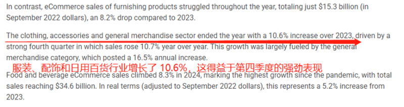 從品類來看,服裝、配飾和日用雜貨的銷售額上漲得較為顯著,第四季度同比增長10.7%。食品和飲料也是比較火熱的品類,2024年全年銷售額為346億美元,同比增長了8.3%。與之形成鮮明對比的是,家具產品的電商銷售額走低,2024年全年銷售額僅為153 億美元,同比下降了8.2%。