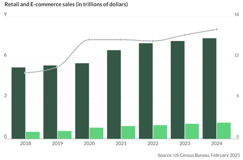 與此同時,2024年全年美國電子商務銷售額預計為1.19 萬億美元,同比增長8.1%,漲幅同樣高于零售業。此外,美國電商行業在整個零售業的地位也不斷提升。去年第四季度,美國在線銷售額占到了零售總額17.9%的份額。全年在線銷售額占零售總額的比例則為16.1%,相較于上一年同期的15.3%,增長了0.8個百分點。