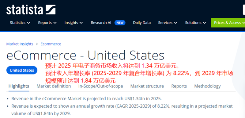 根據Statista公布的數據,2025年美國電子商務市場收入預計為1.34萬億美元。2025-2029年期間,這一市場的規模會以8.22%的復合年增長率不斷擴大,并在2029年增長至1.84萬億美元。屆時,美國電商用戶數量將達到3.335億,電商用戶滲透率也會高達97.1%,比2025年的87.9%高出將近10個百分點。
