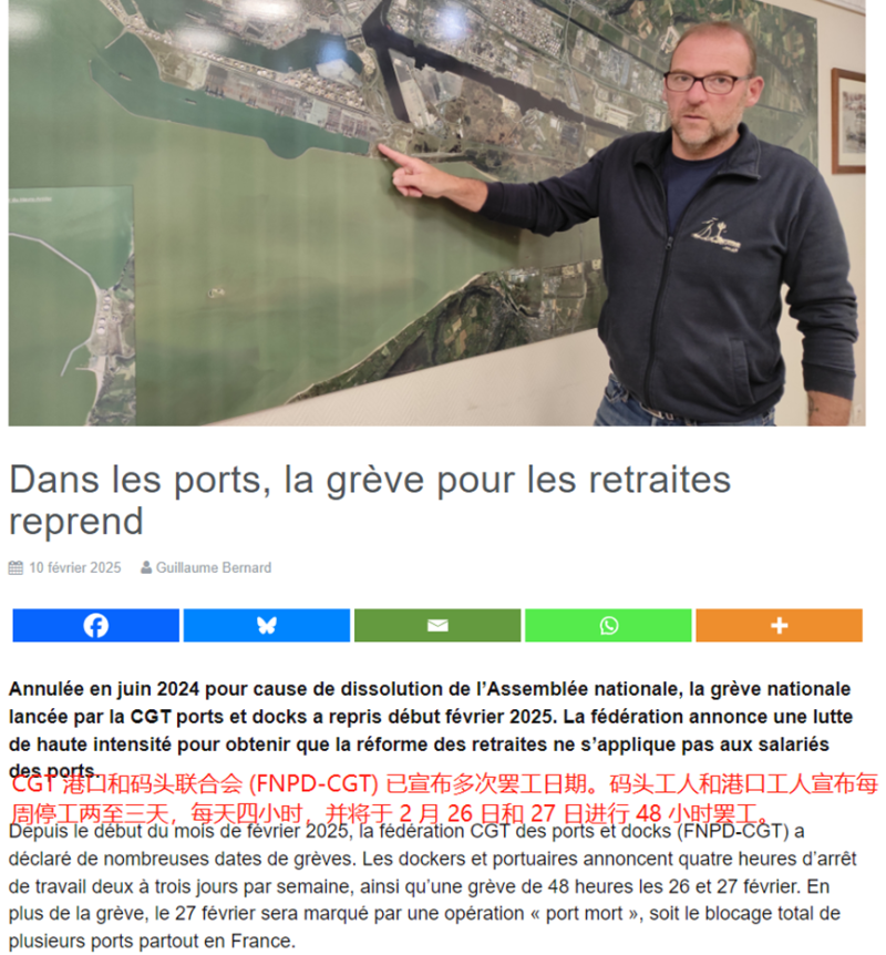 自2月以來,法國港口罷工事件持續發酵。CGT港口和碼頭聯合會(FNPD-CGT) 已經舉行了多次大規模罷工活動,大批碼頭工人和港口工人走上街頭,要求更好的工作和退休金待遇。他們每周罷工兩至三天,每天四小時。此外,工會還宣布,在2月26日至27日期間,工人們將進行48小時的大罷工,2月27日當天甚至還將全面封鎖法國全國的多個港口,名為“死港行動”。