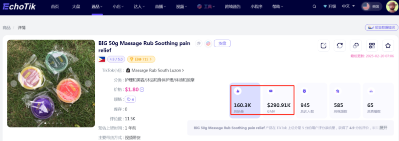 在菲律賓的TikTok電商平臺上,一款來自本土小店Massage Rub South Luzon的按摩膏近日成為了熱銷產品,售價僅為1.8美元。數據顯示,自2024年推出這款按摩膏以來,銷量持續攀升,成功躋身TikTok菲律賓護理美容類目日榜第八位。截至2025年2月21日,該產品的總銷量已突破16萬件,累計GMV高達29萬美元。