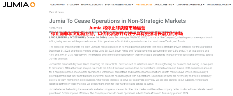 Jumia關閉南非和突尼斯業務 圖源:investor.jumia