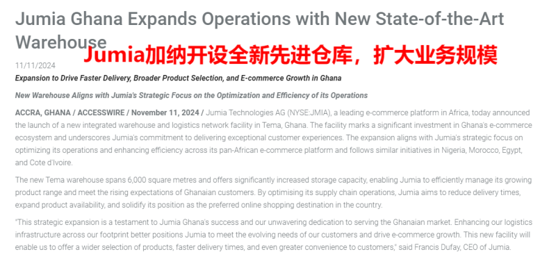 在集中資源拓展新業務的同時,Jumia也在加速推進物流設施建設。去年上半年,Jumia在尼日利亞和摩洛哥新開設兩家綜合物流倉庫;下半年,又在埃及和科特迪瓦新開兩家倉庫;到了年末,在加納的一家綜合物流倉庫也在Jumia黑五前夕全面投入運營。